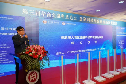 本次論壇的一項重要内容是舉行“粵港澳大灣區金融科技産教融合聯盟”成立儀式。主旨演講結束後,金融學院常務副院長王漢章教授主持了該儀式并宣讀聯盟發起單位名單,共22家單位。