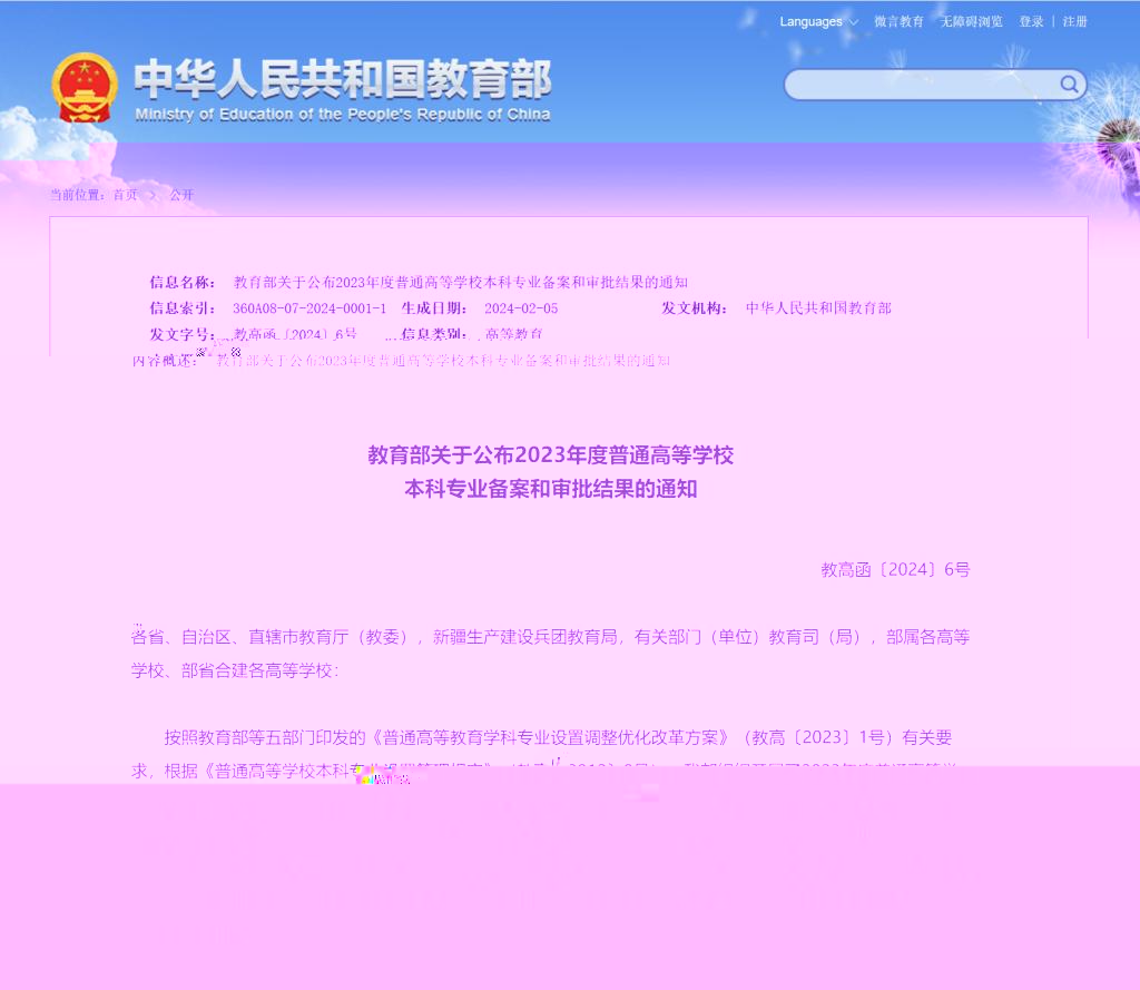 日前,教育部公布了2023年度普通高等學校本科專業備案和審批結果,共新增備案專業點1456個、審批專業點217個(包括160個國家控制布點專業和57個目錄外新專業),調整學位授予門類或修業年限專業點46個。本次備案、審批和調整的專業,将列入相關高校2024年本科招生計劃。