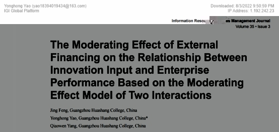 近日,會計學院青年教師馮婧(第一作者)、姚永紅(通訊作者)、楊俏文合作發表了題為“The Moderating Effect of External Financing on the Relationship Between Innovation Input and Enterprise Performance Based on the Moderating Effect Model of Two Interactions”(外源融資對創新投入和企業績效的影響研究——基于二次交互的調節效應模型)的論文。該論文發表于《Information Resources Management Journal》期刊,該期刊屬于EI核心檢索期刊。